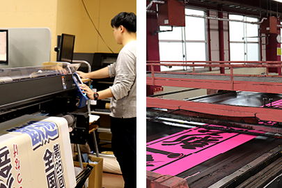 「小ロットを安価で作りたい」「写真入りやフルカラーデザインの物を安価で作りたい」そんなお客様のご要望には、最新デジタル染色で!また、中・大ロットにはオート捺染で対応いたします。よりよい品質を、より安く、より早く。