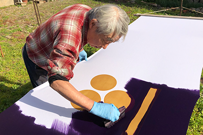 ■手捺染/シルクスクリーンの版にスキージと呼ばれる大型のヘラを用い、手作業で染め上げる染色法です。